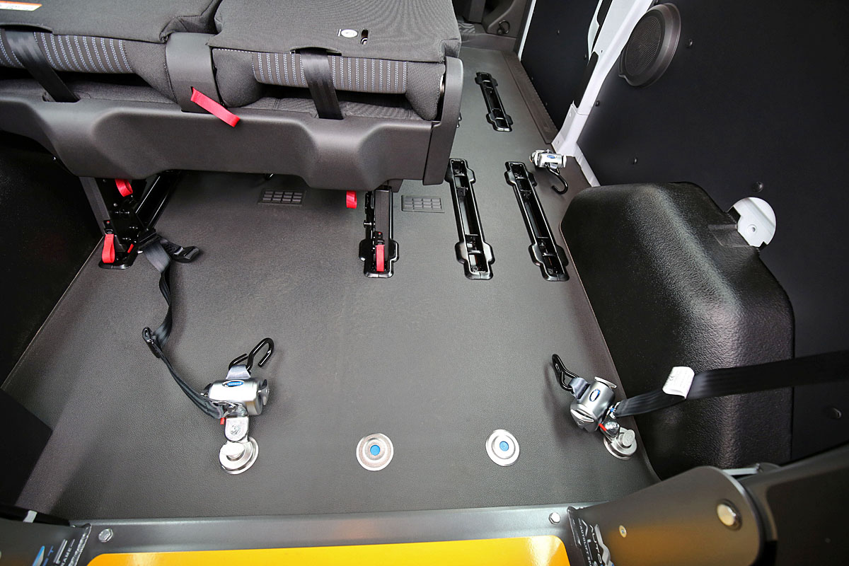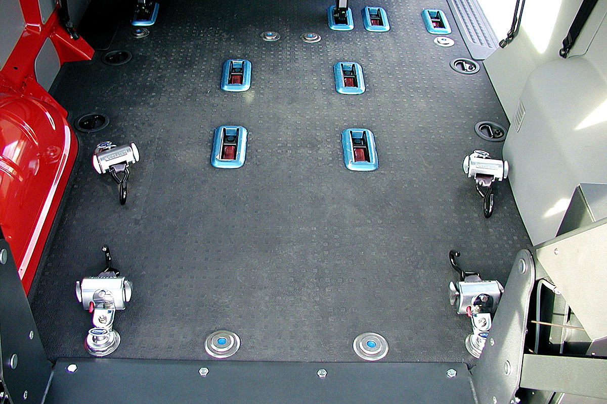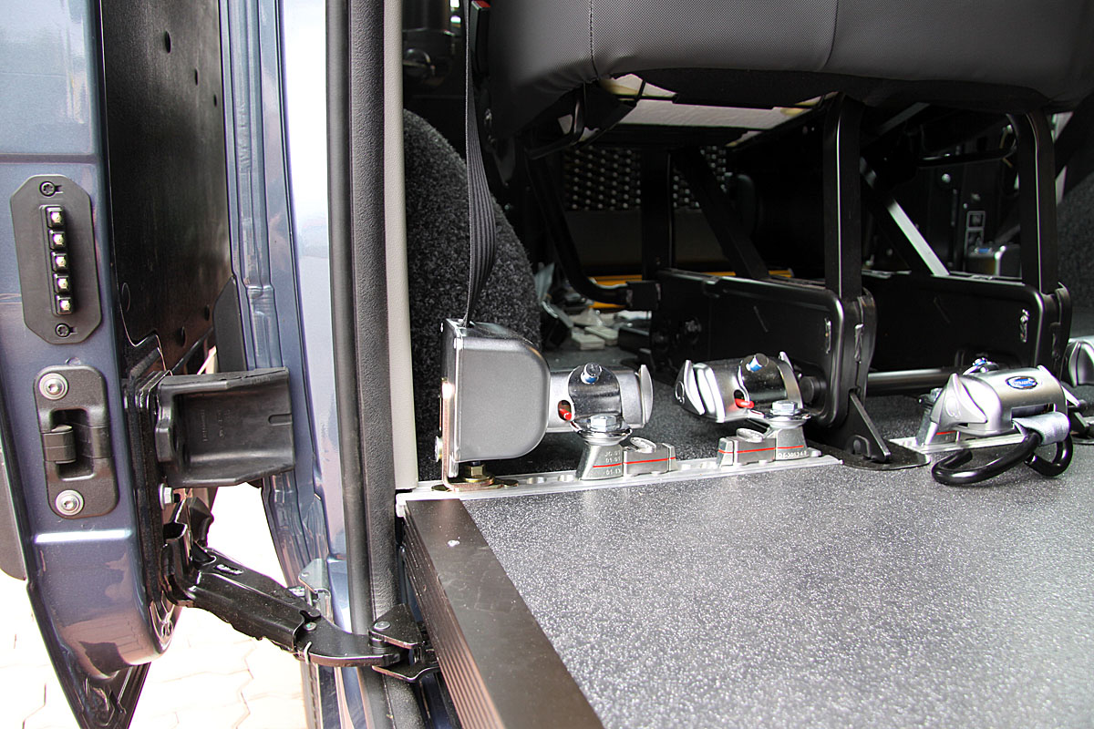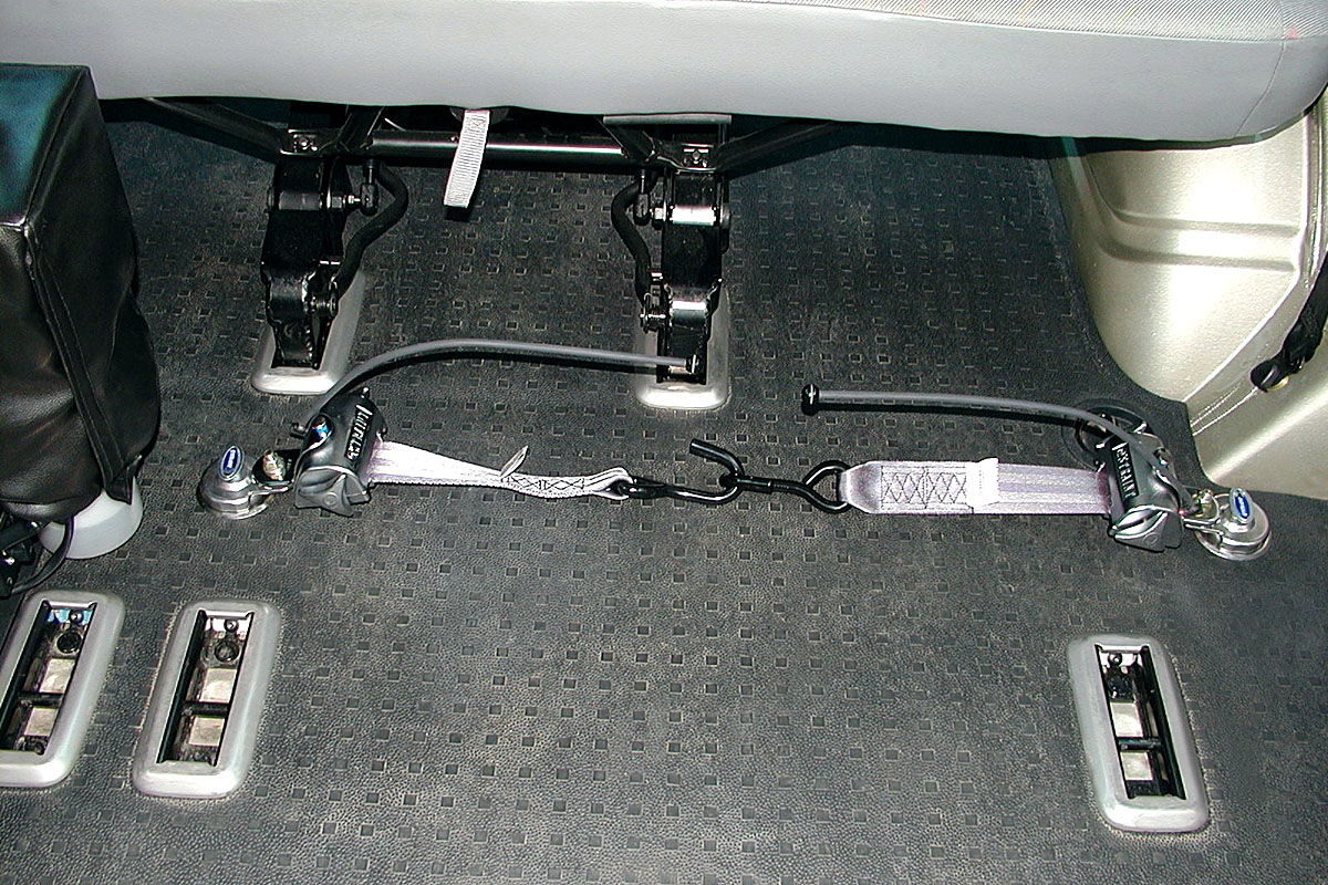 Vozík je ukotven pomocí čtyř samonavíjecích bezpečnostních pásů, které jej pevně a stabilně drží na požadovaném místě.