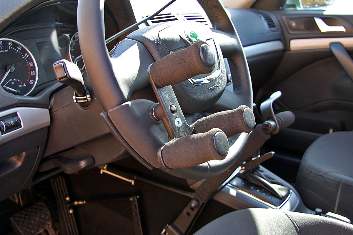 Pomocí tohoto přípravku může postižená osoba bezpečně ovládat volant, aniž by jej musela uchopovat prsty.
